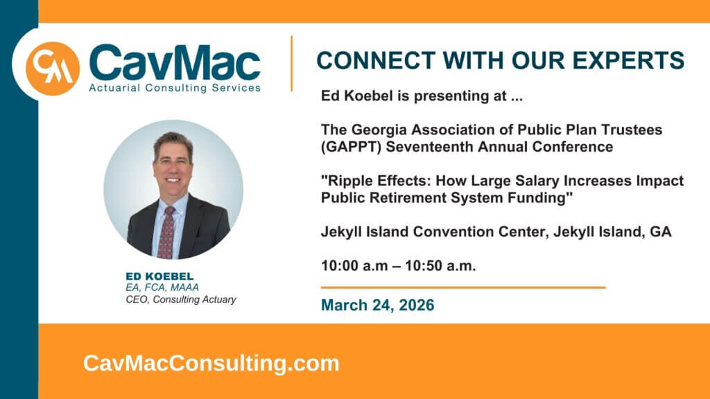 CavMac is pleased to announce that Chief Executive Officer and Consulting Actuary Ed Koebel, EA, FCA, MAAA, will present at the Georgia Association of Public Plan Trustees Seventeenth Annual Conference…
